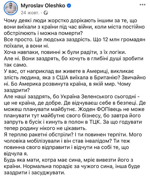 Но дело не только в том, что Олешко, вероятно, выехал за пределы Украины мошенническим путем, в нарушение законодательства Украины. В своих публикациях он пишет, что люди завидуют ему из-за пребывания за границей и уклонения от своего долга, а также провоцирует поступать также и другим.