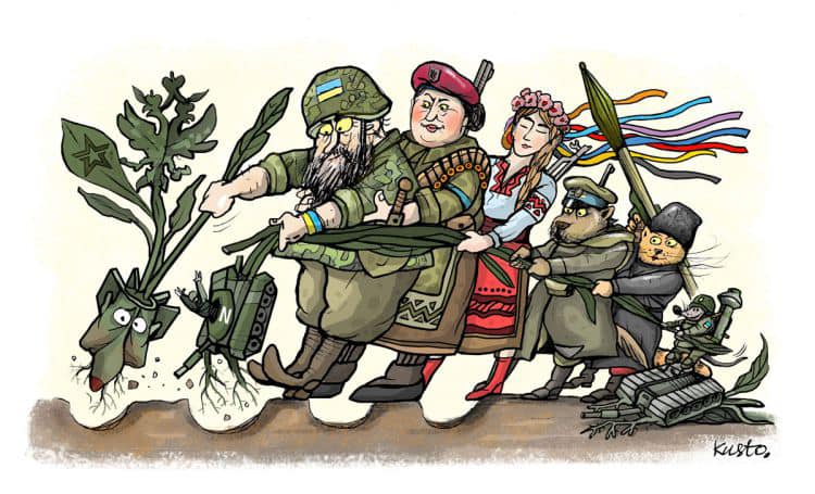 Еще одна иллюстрация стилизована под сказку "Репка", герои которой - украинцы, от ВСУ и мужчин до женщин, девушек, детей и даже животных. Вся Украина объединилась, чтобы раз и навсегда "выкорчевать" Россию-репу из нашей страны.