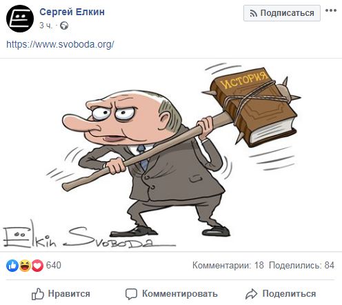 На карикатуре Путин держит в руках палку к которой прикреплена книга истории.