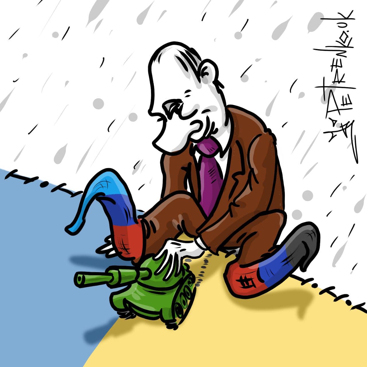 На карикатуре изображен великовозрастной "мальчик", похожий на президента России, в пинетках, цветов флагов самопровозглашенных "ДНР" и "ЛНР" - черный, синий, красный и голубой, синий, красный соответственно. "Ребенок" сидит на границе сине-желтого коврика и играется танчиком, при этом мило и невинно улыбаясь.