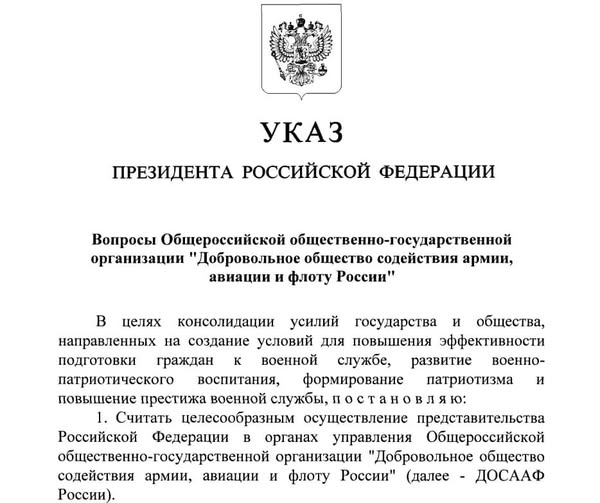 В контексте этого напомним, что 3 февраля хозяин Кремля подписал указ о представительстве РФ в органах управления Добровольного общества содействия армии, авиации и флоту России.