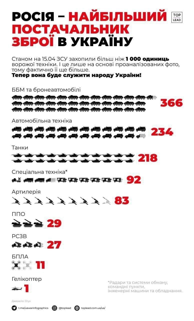 По состоянию на 15 апреля Вооруженные силы Украины захватили более 1000 единиц вражеской техники - теперь она послужит украинским защитникам.