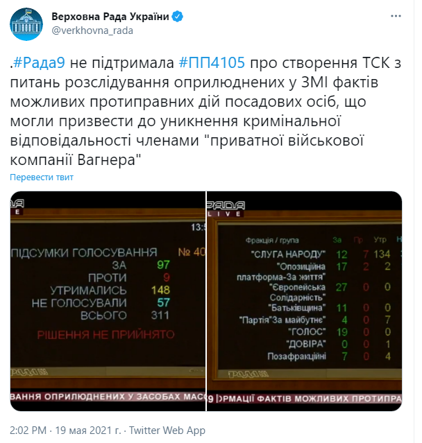 В среду, 19 мая, Верховная Рада на пленарном заседании провалила создание временной следственной комиссии для изучения так называемого дела "вагнеровцев" (проекты №4105 и №5243).