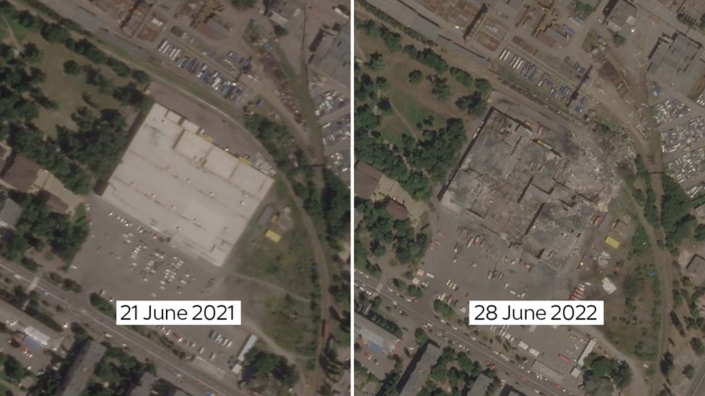 В сети показали, как выглядит здание торгово-развлекательного центра в Кременчуге после ракетных обстрелов на спутниковых снимках.