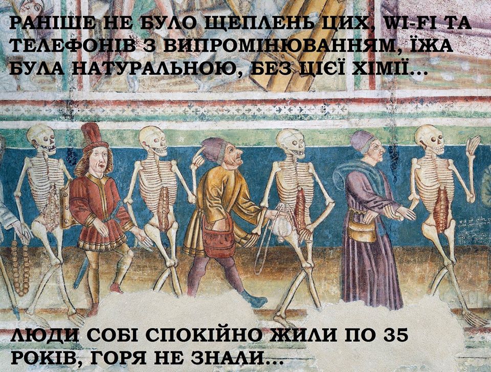 Для иллюстрации была использована средневековая картинка, изображающая шествие граждан со скелетами. Надпись на изображении гласит: "Раньше не было прививок этих, WI-FI и телефонов с излучением, еда была натуральной, без химии этой… Люди себе спокойно жили по 35 лет, горя не знали".