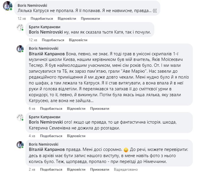 Он отметил, что несколько недель назад запостили воспоминание о любимой передаче миллионов граждан "Катрусин Кінозал" и вдруг один из читателей признался, что виноват в исчезновении куклы, из-за которой передачу когда-то закрыли.
