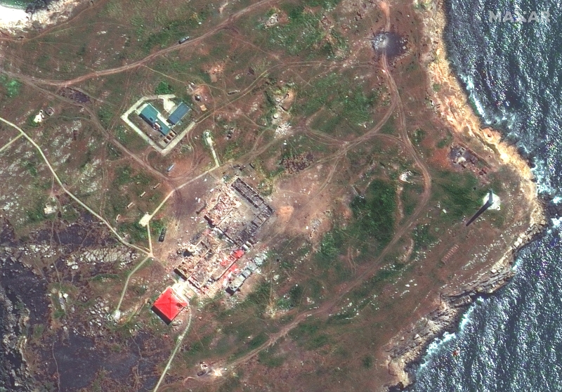 Появились снимки острова Змеиный со спутника. В частности на них можно увидеть подбитый ВСУ и затопленный на прошлой неделе вражеский десантный катер "Серна".