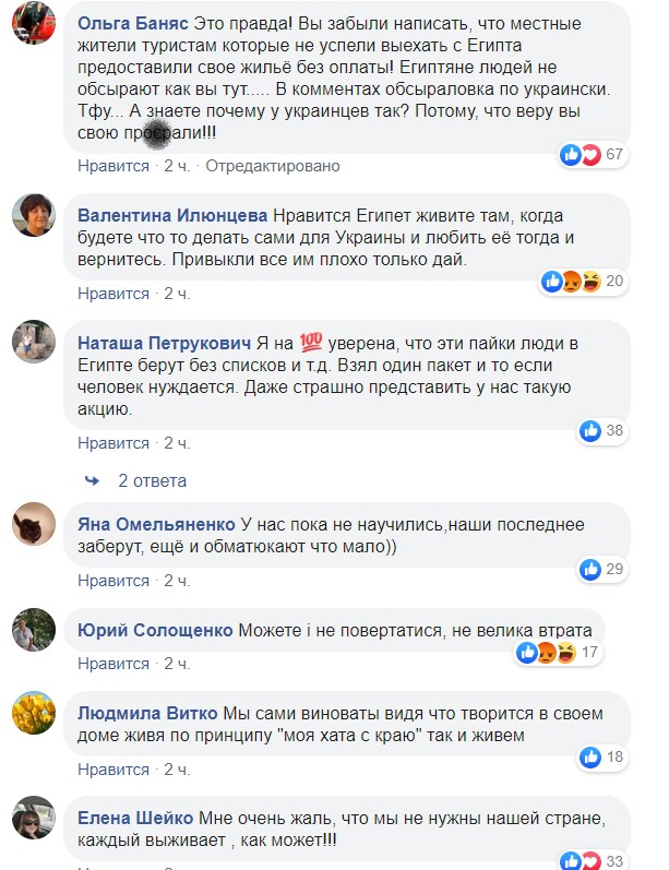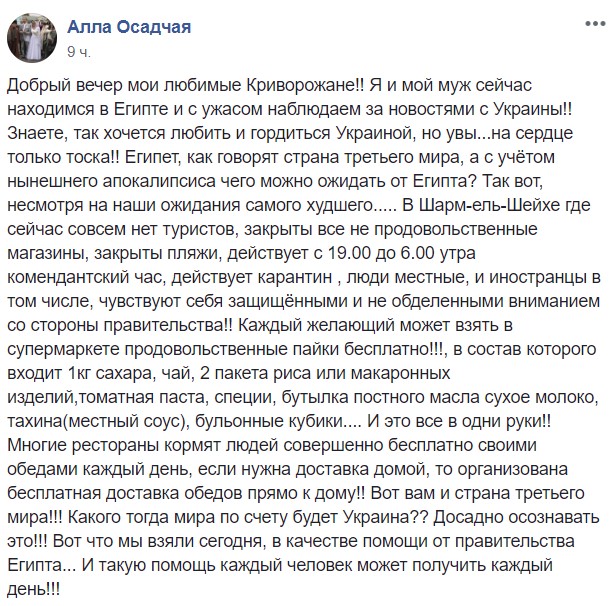 "В состав которого входит 1кг сахара, чай, 2 пакета риса или макаронных изделий,томатная паста, специи, бутылка постного масла сухое молоко, тахина(местный соус), бульонные кубики.... И это все в одни руки!! Многие рестораны кормят людей совершенно бесплатно своими обедами каждый день, если нужна доставка домой, то организована бесплатная доставка обедов прямо к дому!! Вот вам и страна третьего мира!!! Какого тогда мира по счету будет Украина?? Досадно осознавать это!!! Вот что мы взяли сегодня, в качестве помощи от правительства Египта... И такую помощь каждый человек может получить каждый день", - написала она.