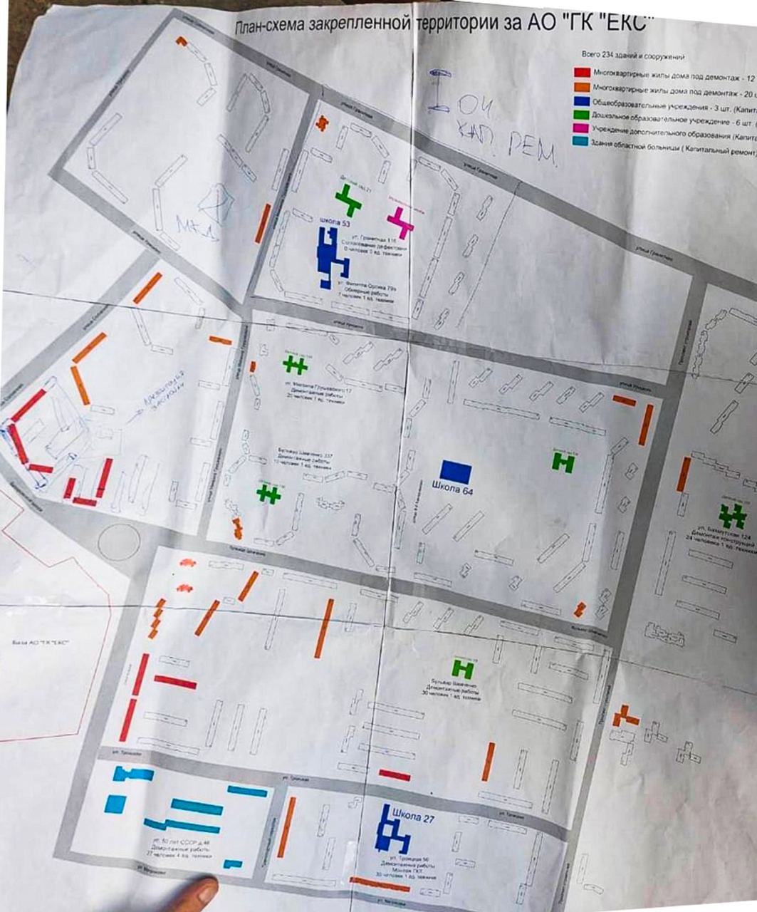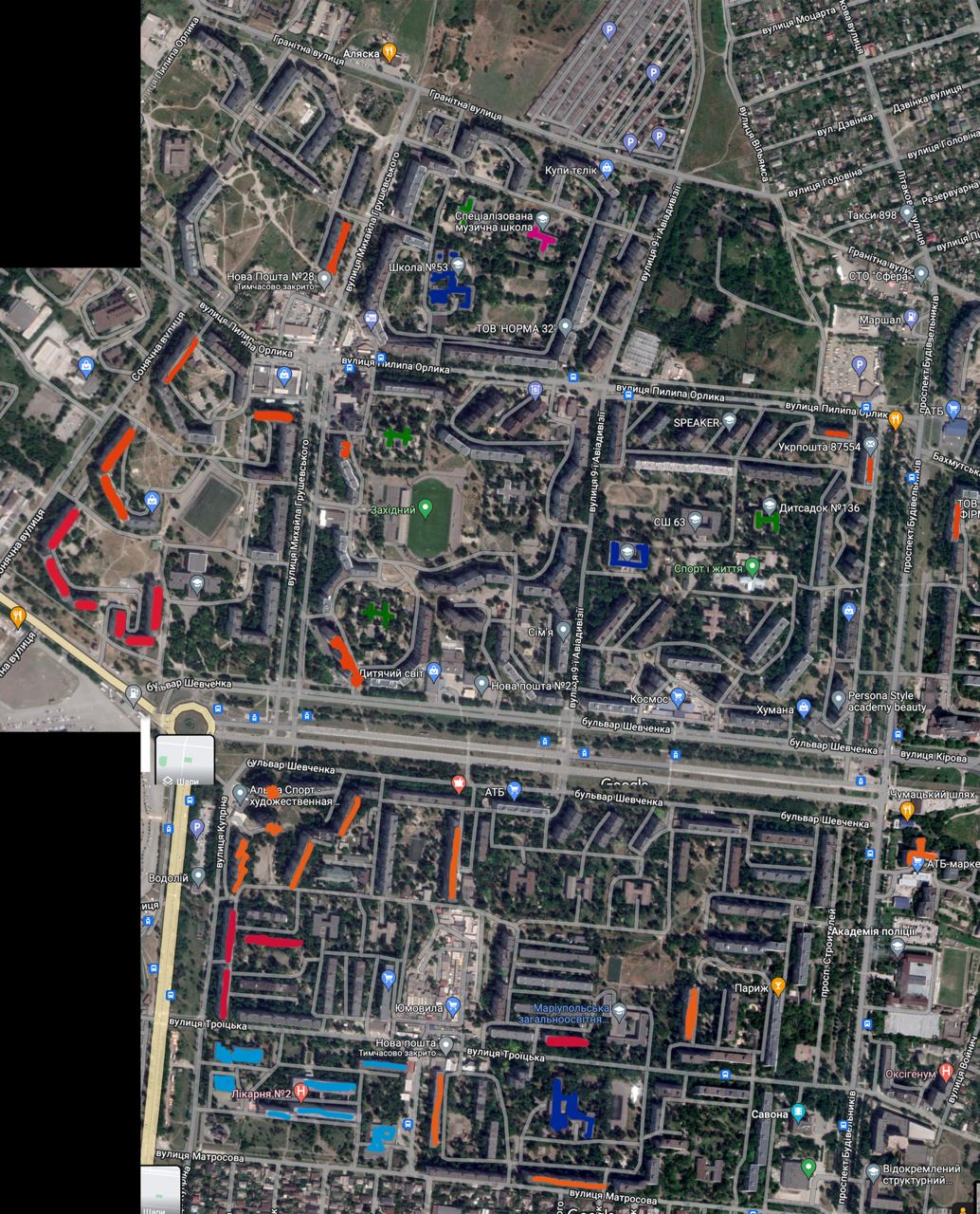 "Для удобства и понятности мы перенесли план на карту Мариуполя с сохранением отметок оккупантов. Красное – дома первой очереди демонтажа, оранжевое – второй. Другое – ремонт", – пишет Андрющенко.