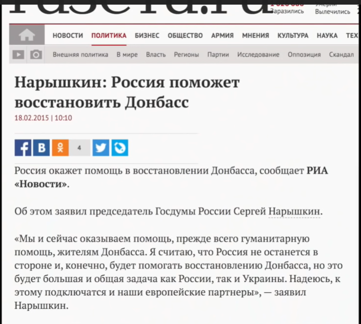 "Стоп, подождите, какие "восстанавливать своими силами"? А как же помощь "великой братской России"? Я же отлично помню, как с 2014 года россияне постоянно заявляли, что они не бросят Донбасс в беде, что они будут помогать своим русскоязычным соотечественникам, спасать русскоязычное население, возрождать и восстанавливать Донбасс", – сказал блогер Денис Казанский, в доказательство показавший публикацию российских СМИ от 18 февраля 2015 года (в день захвата города), в которой глава Госдумы РФ Сергей Нарышкин обещал помогать и восстанавливать Донбасс.