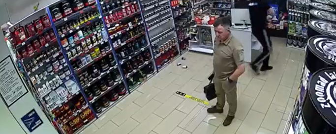 На видео показан небольшой магазин при обстреле, в котором присутствует несколько посетителей. Раздается взрыв и продукты начинают падать с полок. Люди пригибаются, бегут, однако мужчина в форме, похожей на военную по цвету, невозмутимо стоит в центре магазина и покидает его последним.