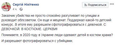 "Заказчик убийства не просто спокойно разгуливает по улицам и руководит облсоветом. Он еще и меценат. Поддержал какой-то детский конкурс. В итоге ему разрешили сфотографироваться с девочкой. С девочкой в костюме церкви! Понимаете, в 2020 году в Украине люди одевают детей в костюм храма? И разрешают фотографироваться с убийцами", - говорится в сообщении.