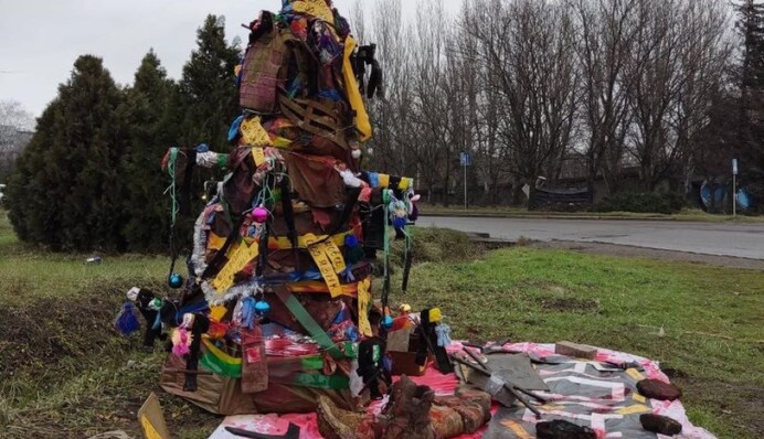 В Константиновке установили елку из касок, бронежилетов, берцов и другой экипировки раненых и погибших защитников.