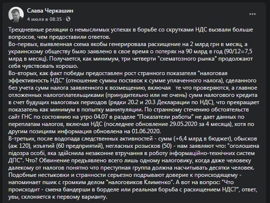 "После водопада следственных активностей - сумм (+6,4 млрд в бюджет), обысков (120), изъятий (60 предприятий), негласных розысков (50) - нам заявляют, что: "оголошена підозра особі, яка здійснила незаконне втручання в роботу інформаційно-технічних систем ДПС". Что? Обвинение предъявлено всего одному налоговику, когда даже человеку далекому от налогов понятно, что преступная группа должна насчитывать десятки человек", - пишет Вячеслав Черкашин.
