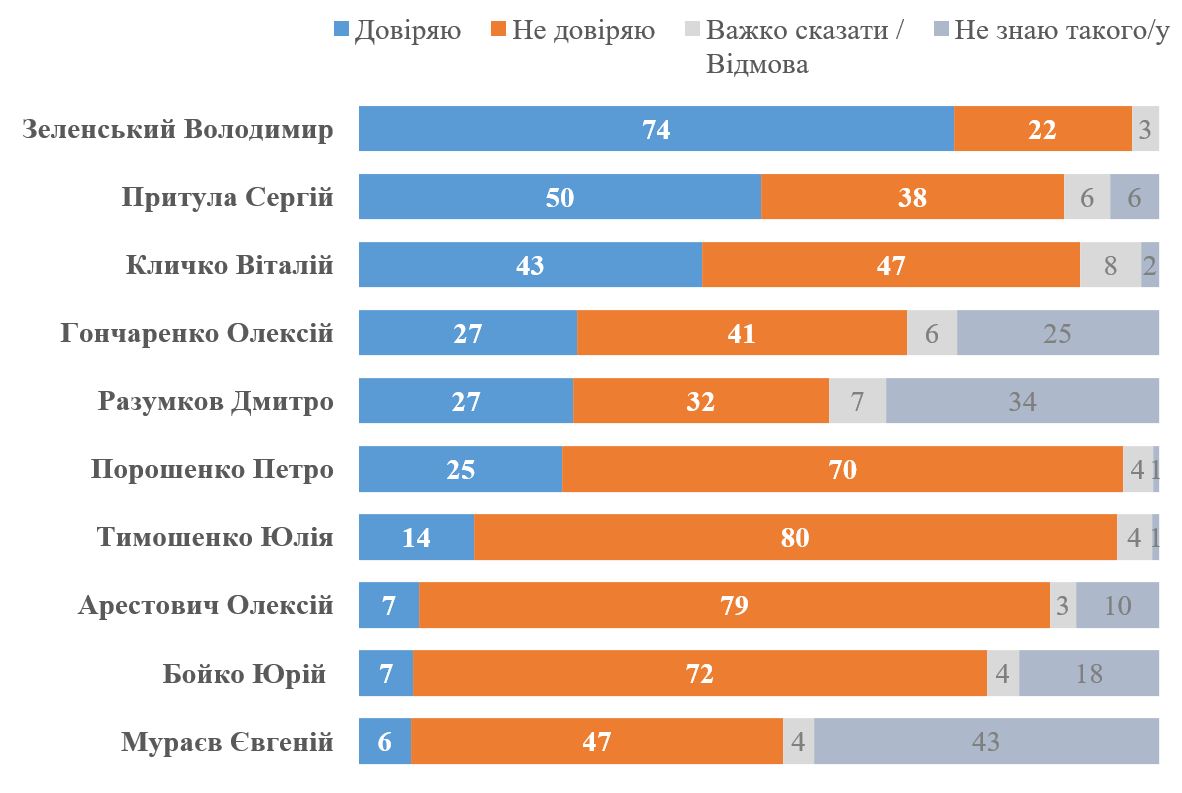 Далее по показателям доверия идут Алексей Гончаренко (27% доверяют, 41% не доверяют; однако в его случае 25% не знают, кто это), Дмитрий Разумков (27% доверяют, 32% не доверяют; в его случае также многие не знают, , кто он – 34%), Петр Порошенко (25% доверяют, 70% не доверяют). Юлии Тимошенко доверяют 14%, не доверяют – 80%.
