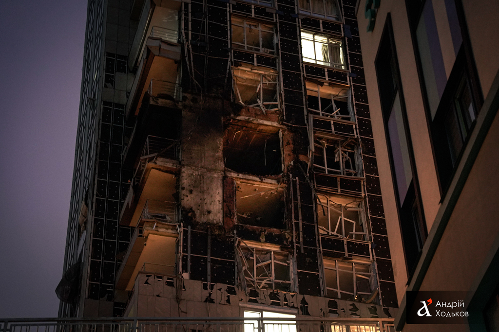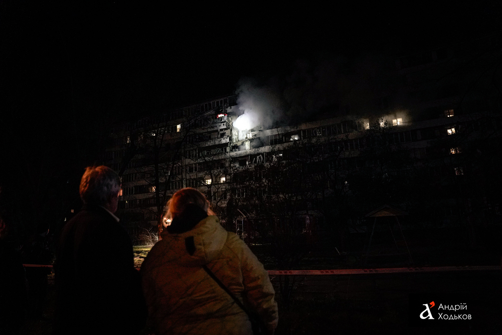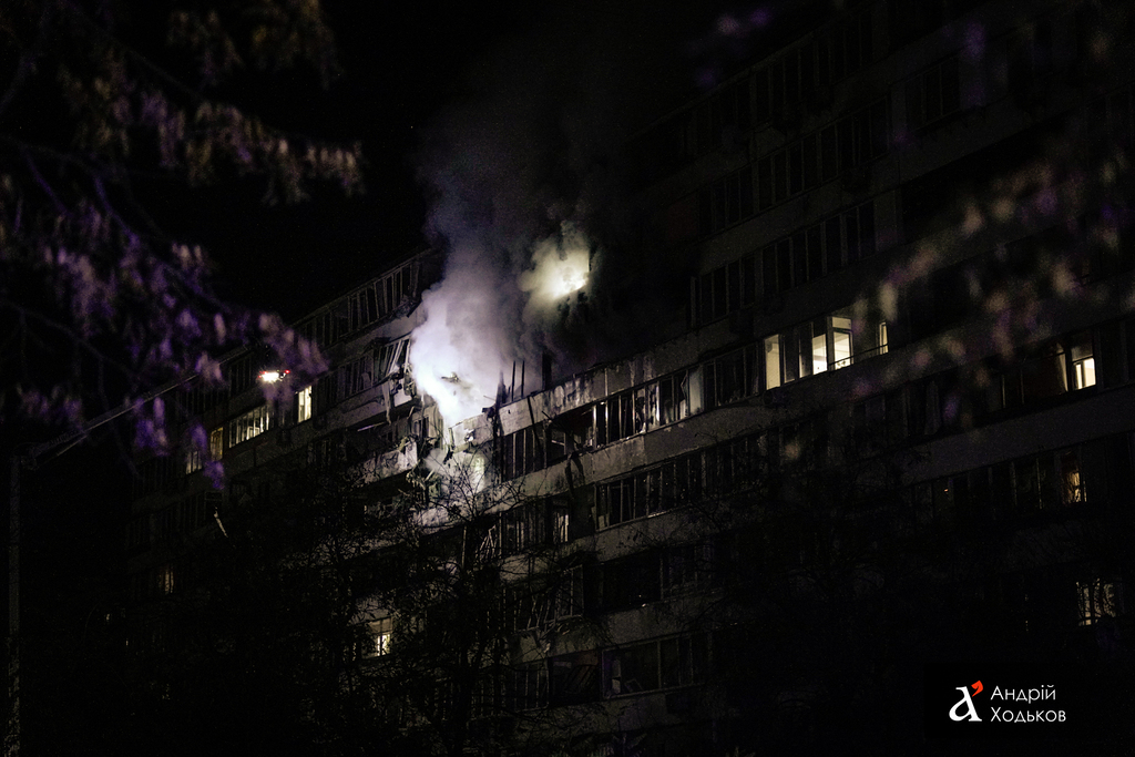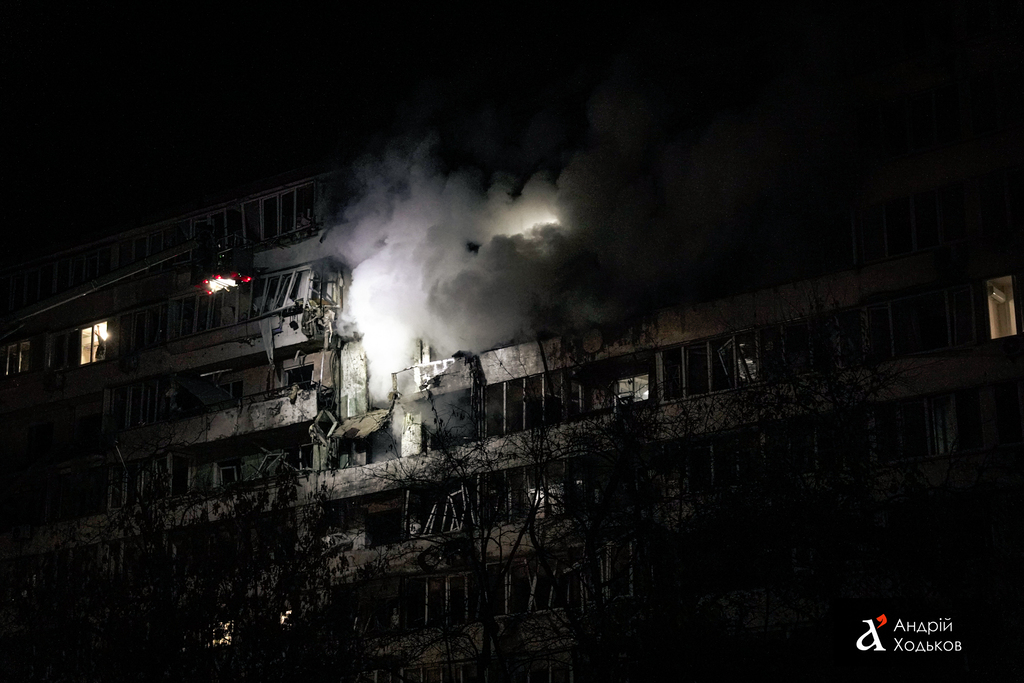 В Днепровском районе вражеский удар пришелся на 9-этажный жилой дом. Это привело к разрушению и пожару на 6-7 этажах, а также «существовала угроза распространения огня». В результате этого попадания один человек погиб, пятеро — пострадали, а 17 человек, среди которых трое детей, были спасены. Пожар локализован, продолжается ликвидация и поиск возможных пострадавших.