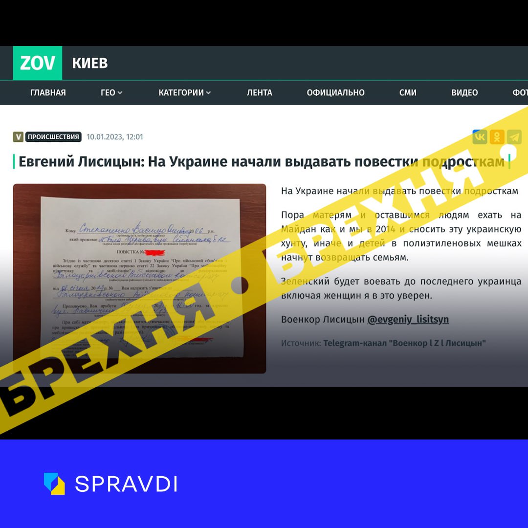 В России прокремлевские паблики распространяют фейковую новость о том, что в Украине якобы повестки вручают подросткам. Для подтверждения даже фото документа подделали.