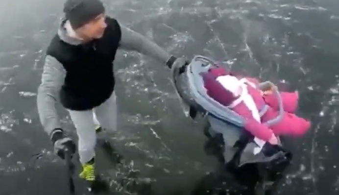 В Харькове молодая пара решила покататься на льду на коньках. При этом развлечения они устроили и своему маленькому ребенку, которого катали на тонком льду в коляске.