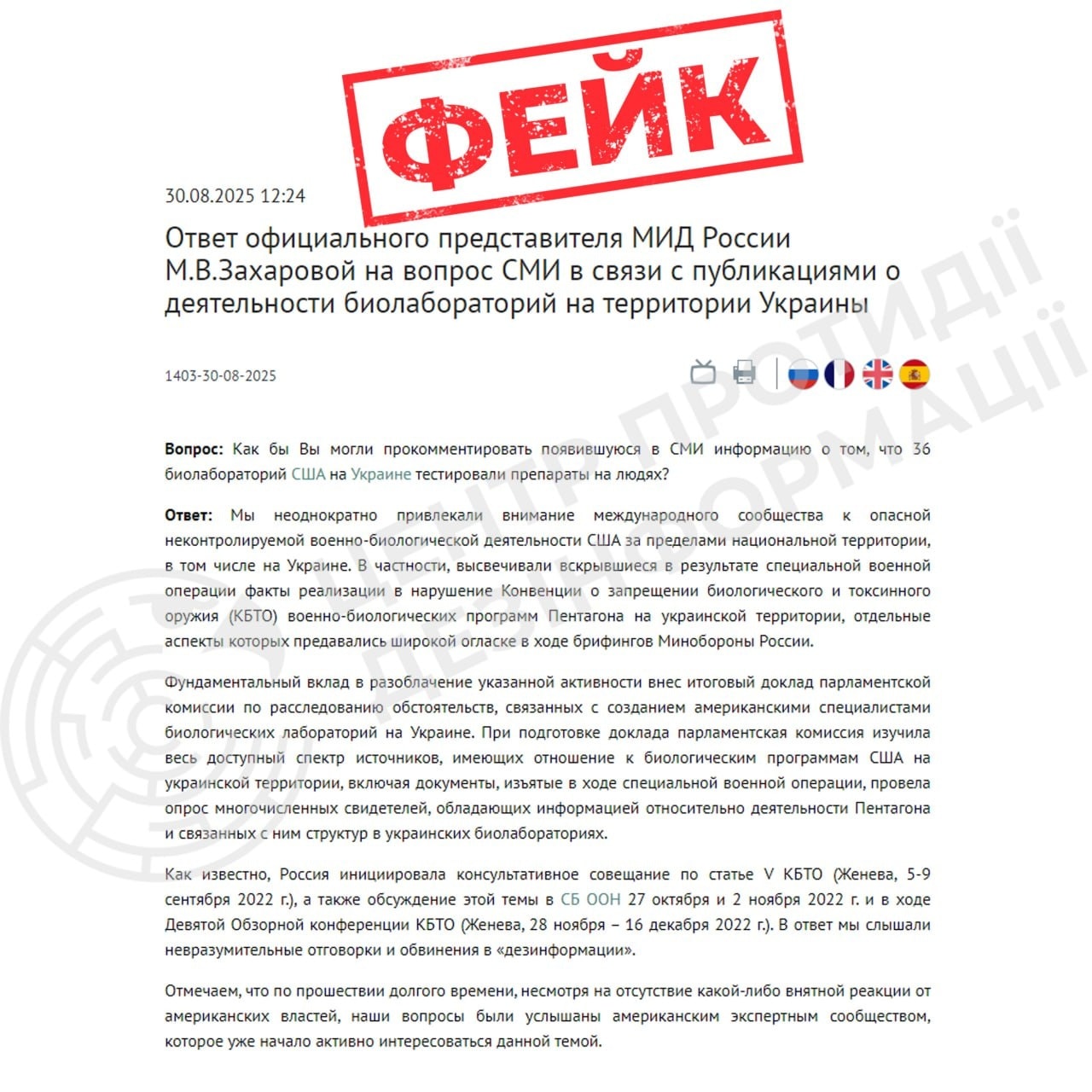 "Фейк об "украинских биолабораториях" россия активно продвигает еще с 2022 года. Никакого подтверждения их существования мир так и не увидел. В то же время "доказательная база" кремля обычно основывается на манипуляциях, искажениях и высказываниях маргинальных персонажей, которых ru-пропаганда пытается представить как "влиятельных экспертов", - отметили в ЦПД.