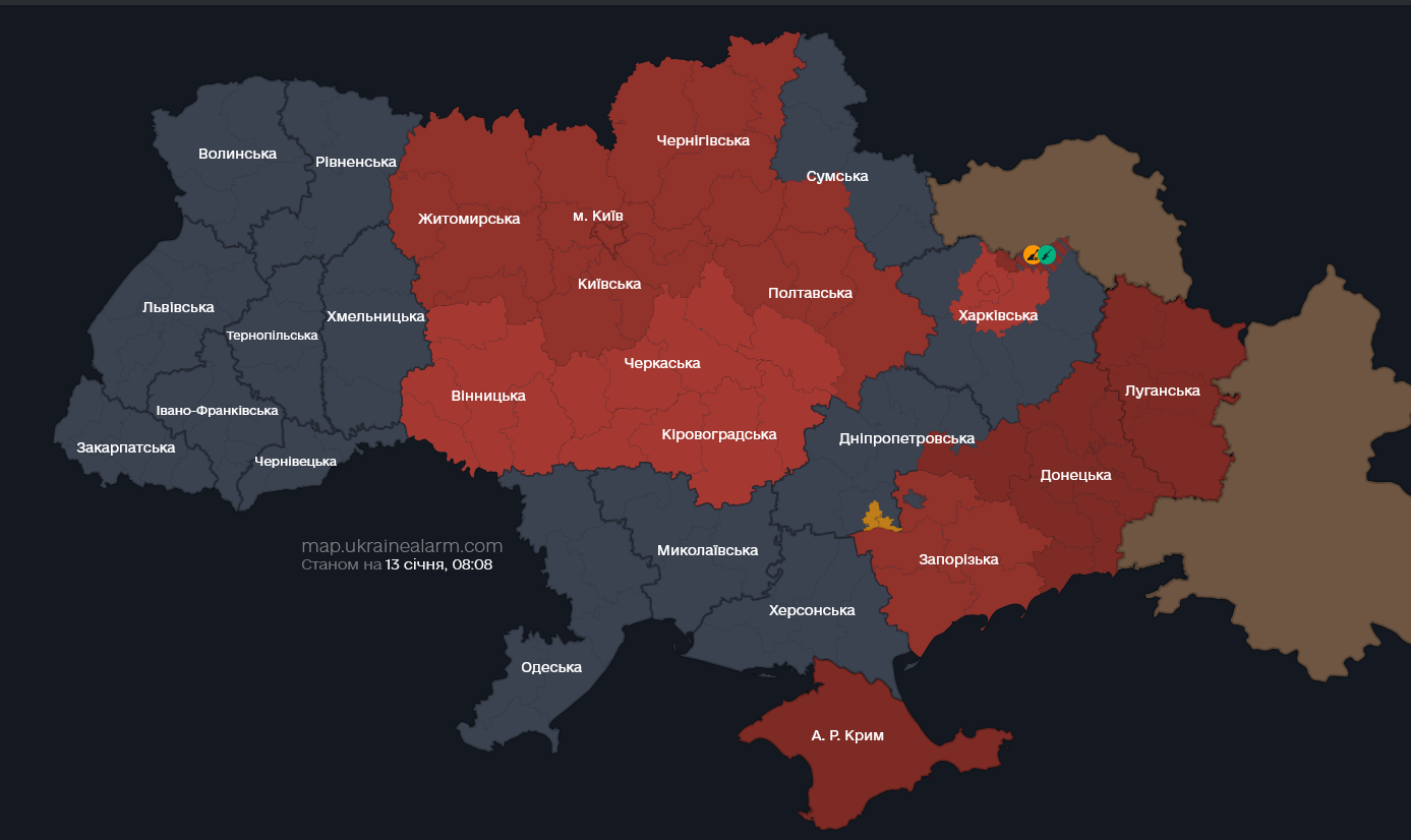 Утром во вторник, 13 января, Российская Федерация нанесла комбинированный удар по территории Украины, применив крылатые ракеты и ударные беспилотники. Под угрозой оказались Киевская, Сумская, Черниговская, Полтавская и другие области. Из-за массированной атаки в столице введены экстренные отключения электроэнергии и изменен режим работы общественного транспорта.