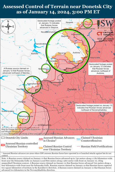 14 января российские и украинские войска продолжили боевые действия вблизи Бахмута, однако подтвержденных изменений линии фронта на этом участке не последовало. Позиционные боевые действия продолжались к западу от Бахмута в районе Хромового и юго-западнее Бахмута в районе Клещеевки, Андреевки и Нью-Йорка (к западу от Горловки). Под Авдеевкой 14 января продолжались позиционные бои, однако подтвержденные изменения линии фронта на этом участке не зафиксированы.