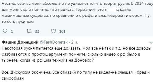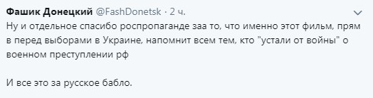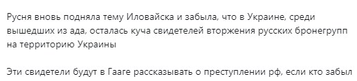 "Россияне вновь подняли тему Иловайска и забыли, что в Украине, среди вышедших из ада, осталась куча свидетелей вторжения русских бронегрупп на территорию Украины. Эти свидетели будут в Гааге рассказывать о преступлении РФ, если кто забыл… Спасибо роспропаганде за то, что именно этот фильм, прямо перед выборами в Украине, напомнит всем тем, кто "устали от войны" о военном преступлении РФ ", - отмечает блогер.