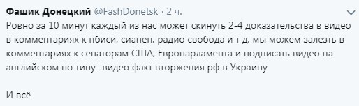 "Ровно за 10 минут каждый из нас может скинуть 2-4 доказательства в видео в комментариях и т.д., мы можем залезть в комментариях к сенаторам США, Европарламента и подписать видео на английском по типу - видеофакт вторжения РФ в Украину", - заявил блогер.