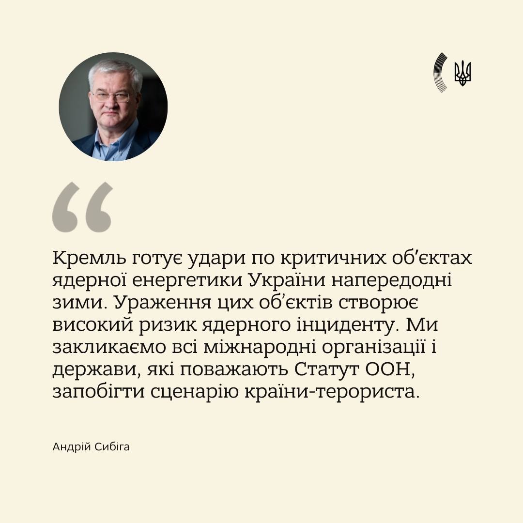 "Россия - единственное государство, которое захватило АЭС в Европе, шантажируя мир. Украинская Формула Мира содержит положение об обеспечении радиологической и ядерной безопасности. Мы призываем все международные организации и государства, которые уважают Устав ООН, не допустить сценария страны-террориста", - отмечает Сибига.