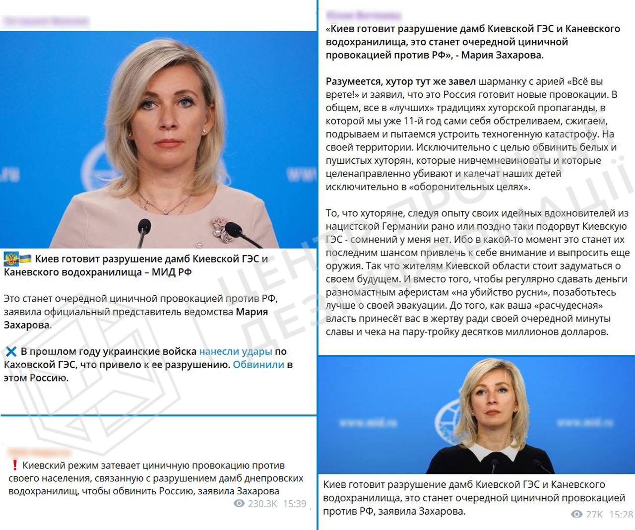Так, официальная представительница российского Министерства иностранных дел Мария Захарова сообщила, что якобы Украина готовит уничтожение дамб Киевской ГЭС и Каневского водохранилища. При этом ответственность планирует переложить на РФ.