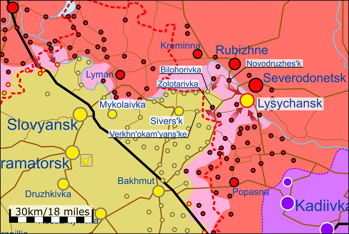 По данным Ukraine War Map, российские оккупационные войска захватили Новодружеск и Золотаревку. Также предполагают, что украинские военнослужащие отступили с Лисичанска и против взял его под контроль.
