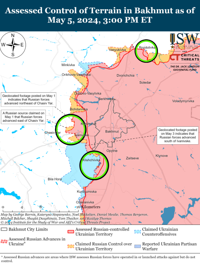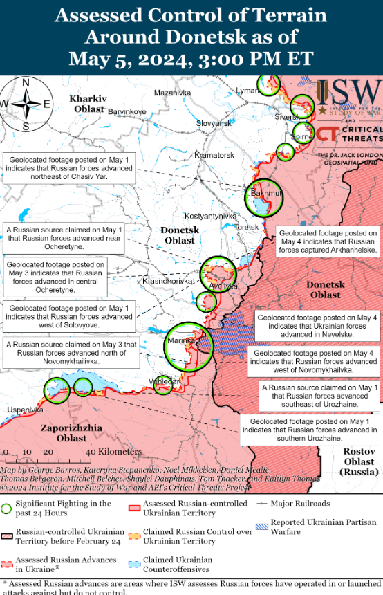Геолокационные кадры, опубликованные 4 мая, указывают на то, что российские войска продвинулись в западной части Котляровки (к юго-востоку от Купянска) и к югу от Новоселовского (к северо-западу от Сватово).