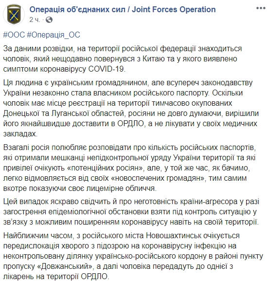 В ближайшее время, из российского города Новошахтинск ожидается передислокация больного с подозрением на коронавирусную инфекцию на неконтролируемой участок российско-украинской границы в районе пункта пропуска "Довжанский", а дальше его передадут в одну из больниц на территории ОРДЛО.