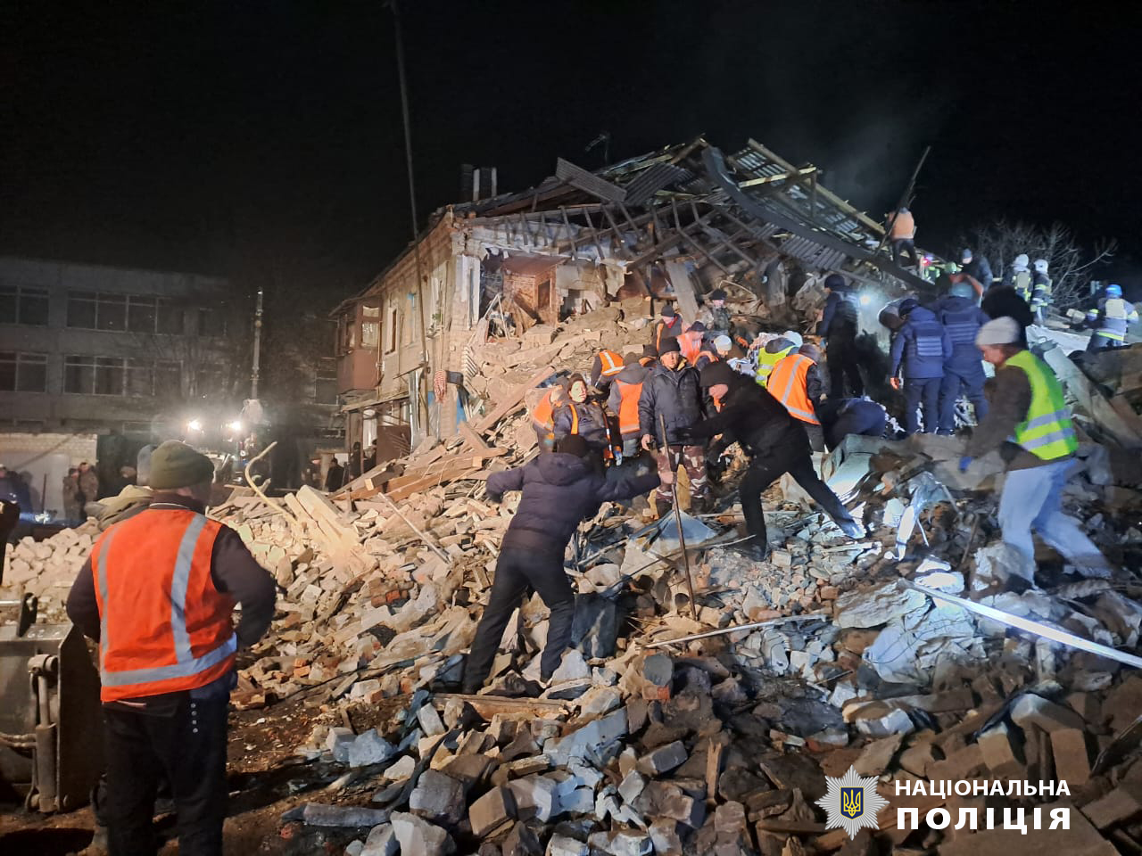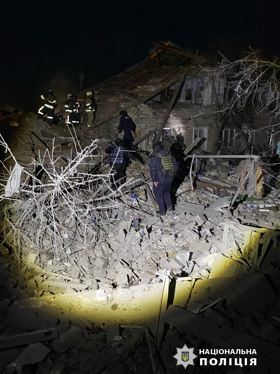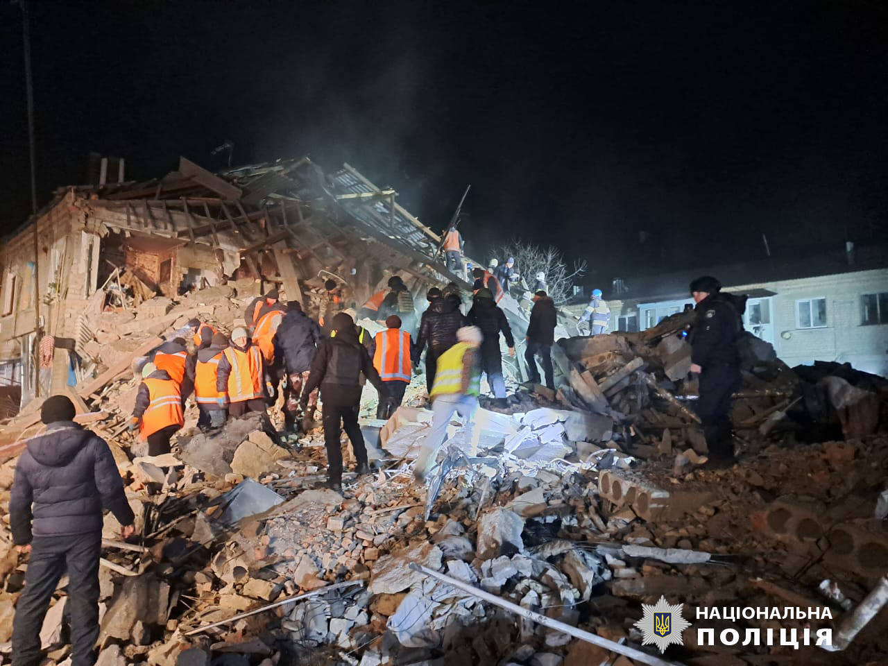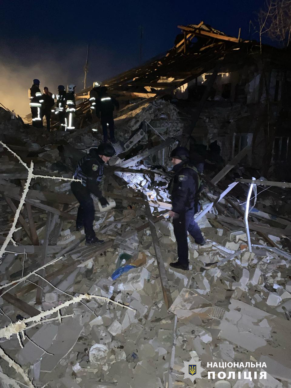 Поврежден двухэтажный дом, в котором из 16 квартир разрушены 8. Также поврежден частный дом и два полицейских автомобиля.