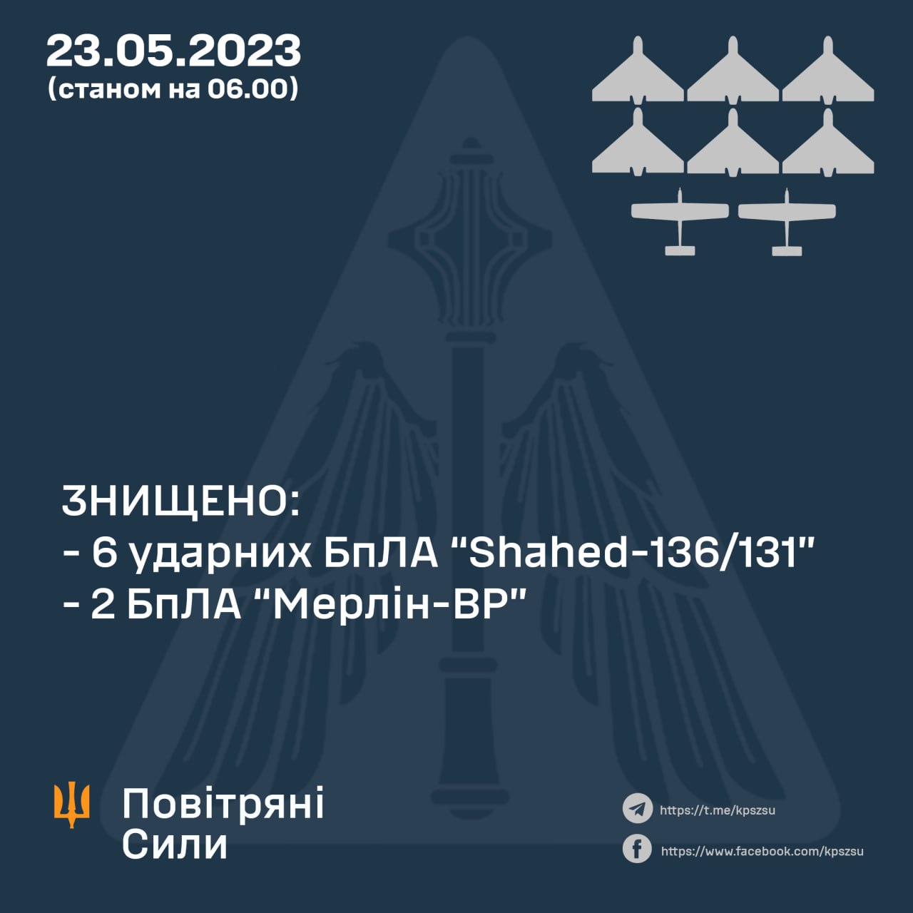 Позже в Воздушных силах ВСУ уточнили, что за минувшие сутки Силами обороны на разных направлениях были уничтожены шесть вражеских ударных БПЛА "Shahed-136/131" и два разведывательных БПЛА "Мерлин-ВР".