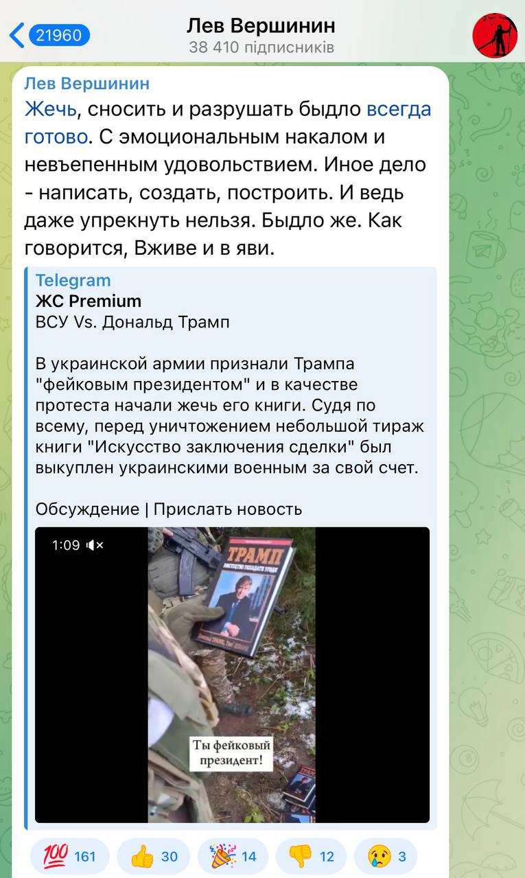 "Новый шедевр российского ИПСО. Страшные фошисты с шевроном "Азова" (чтобы ни у кого не было сомнений, что это именно они) жгут книги Трампа и без выражения зачитывают закадровый текст на плохом украинском. Казалось бы, какой дегенерат может всерьез на такое повестись. Но Z-пропагандист Лев Вершинин не подвел", - написал украинский журналист Денис Казанский.