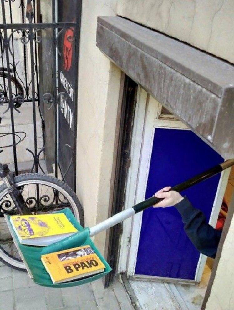 В российском Санкт-Петербурге во время карантина научились по-особенному продавать книги в одном из местных магазинов. Продажа проходит бесконтактно - книги покупатель получает просто на лопате.
