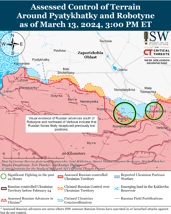 ISW сообщает, что позиционные боевые действия продолжались вблизи Роботино и Вербового (восточнее Роботино).