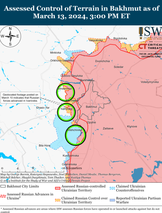 В отчете указано, что украинские силы замедлили продвижение россиян вдоль позиций вблизи линии Бердичи-Орловка-Тоненькое в начале марта. Однако, согласно новым данным отчета, недавно российские войска продвинулись к северо-западу и юго-западу от Авдеевки. В частности, 12 марта российские милблогеры указывали, что оккупанты расширили свой контроль над Тоненькой и захватили новые позиции в лесных массивах между Орловкой и Тоненькой.