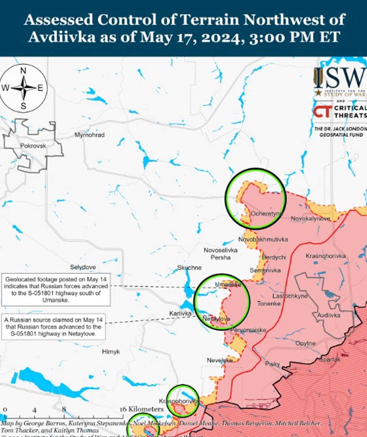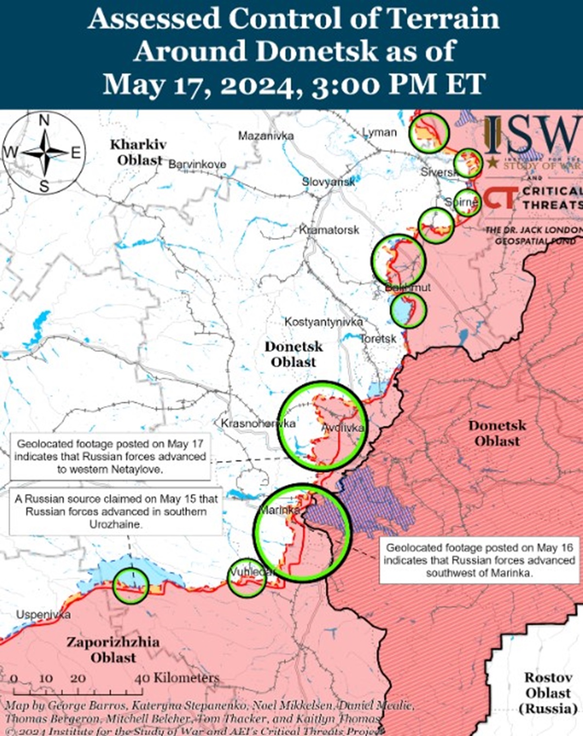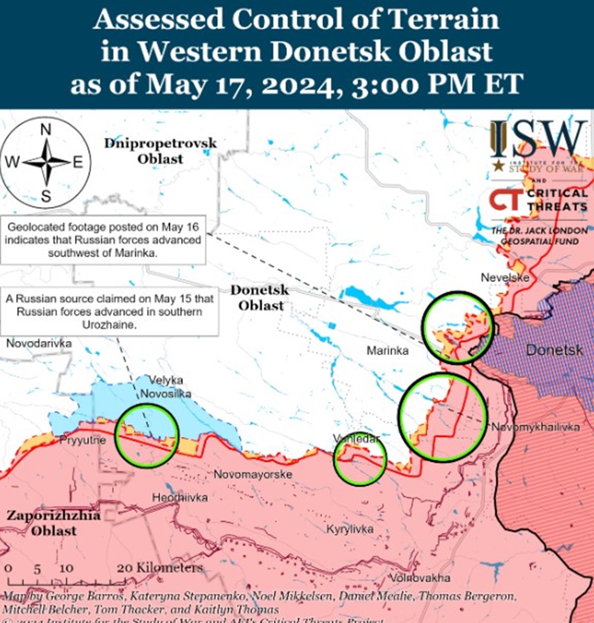 Кроме того, оккупанты 17 мая могли продвинуться к западу от Донецка во время продолжающихся атак на запад и юго-запад от города. Россияне также утверждают, что они продвинулись к западной окраине Георгиевки (к западу от Донецка), но в ISW не нашли визуального подтверждения.
