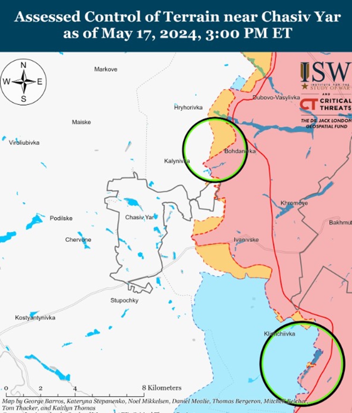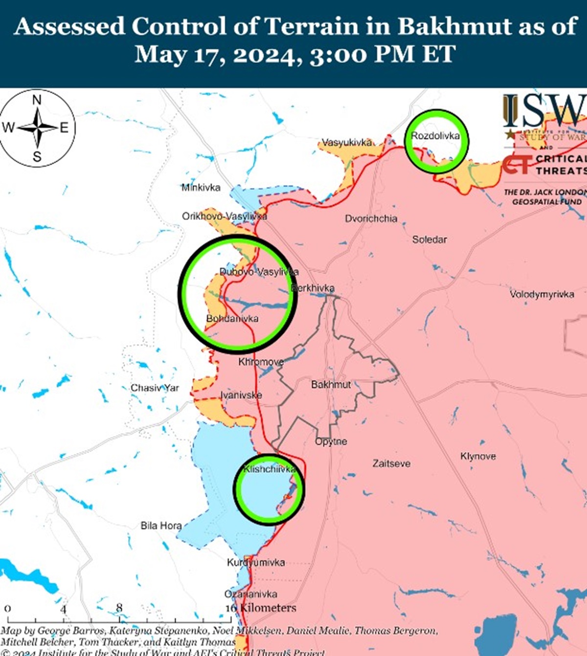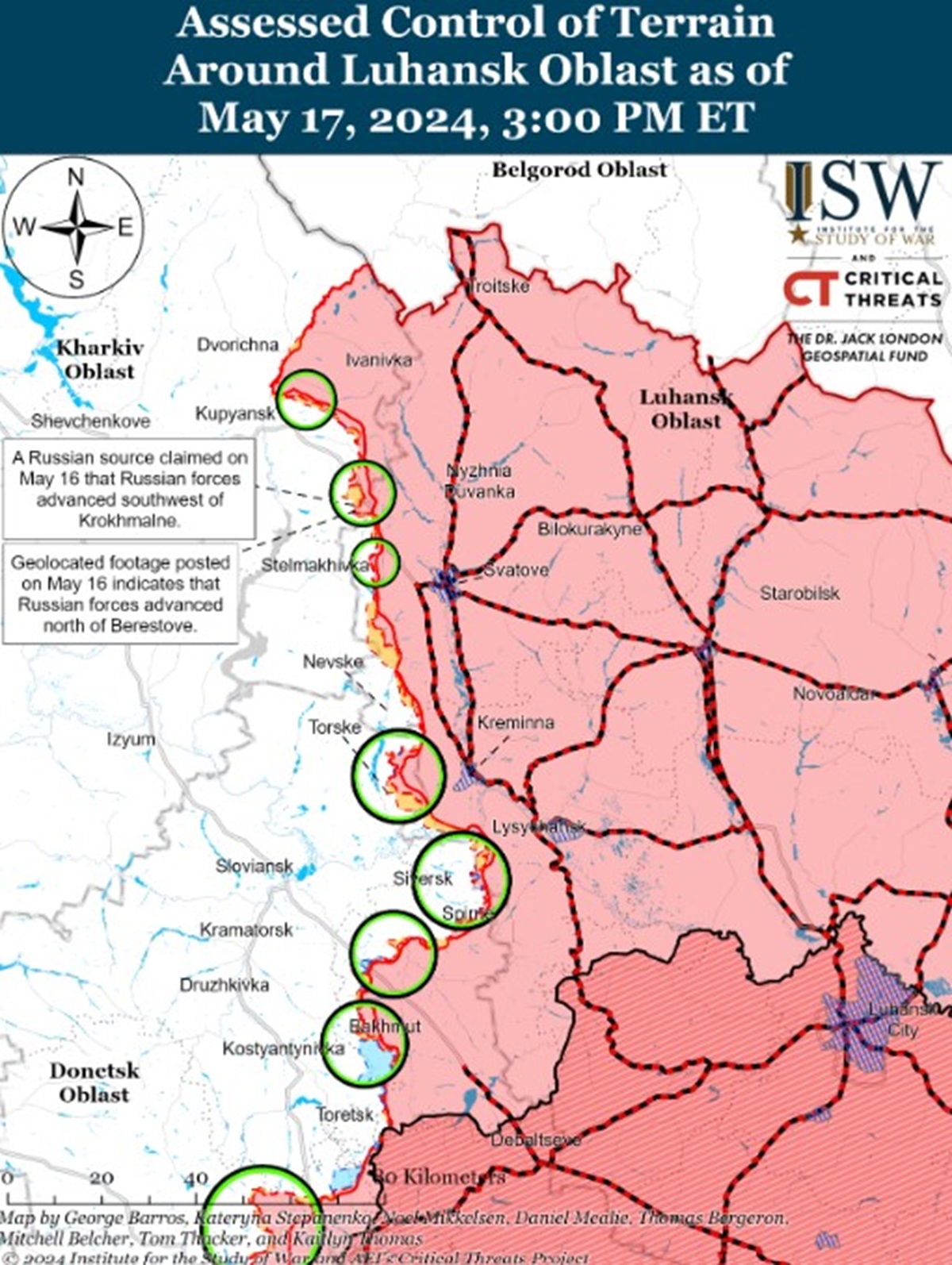 Кроме того, оккупанты 17 мая могли продвинуться к западу от Донецка во время продолжающихся атак на запад и юго-запад от города. Россияне также утверждают, что они продвинулись к западной окраине Георгиевки (к западу от Донецка), но в ISW не нашли визуального подтверждения.