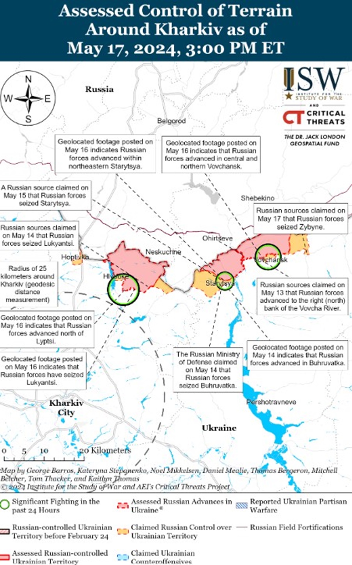 Кроме того, 17 мая оккупанты могли продвинуться под Волчанском, но никаких подтвержденных изменений там не фиксируют. Российские источники утверждают о продвижении восточнее Тихого (к северо-востоку от Волчанска) и "захвате" Зыбиного (восточнее Волчанска), однако аналитики ISW не обнаружили визуального подтверждения этому.