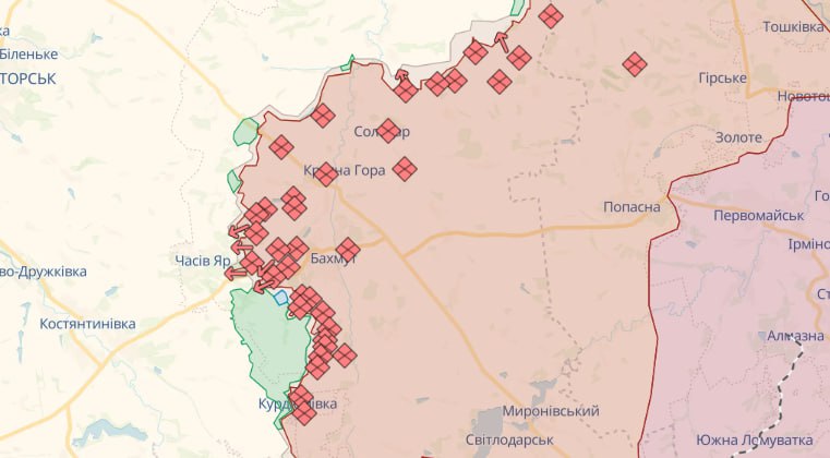 На Бахмутском направлении отражено 33 атаки в районах населенных пунктов Белогоровка Луганской области; Верхнекаменское, Новый, Ивановское, Клещеевка, Андреевка, Раздоловка и Часов Яр Донецкой области, где враг, при поддержке авиации, пытался улучшить тактическое положение.