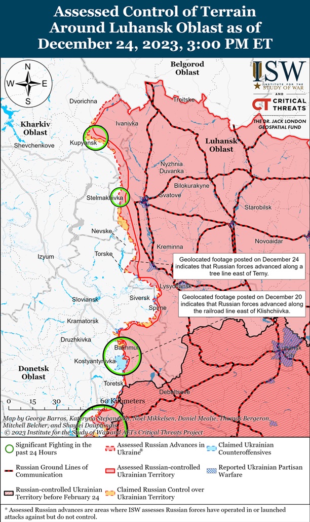 Геолокационные кадры, опубликованные 24 декабря, показывают, что российские войска недавно продвинулись к востоку от Тернив (к западу от Кременной). Российские и украинские источники сообщали, что позиционные боевые действия продолжались на Купянском направлении в районе Синьковки и Стельмаховки (к северо-западу от Сватового) и на Лиманском направлении к востоку от Ямполевки; к югу от Кузьминого; вблизи Тернов, Торского, Дибровы и Серебрянского лесничества.