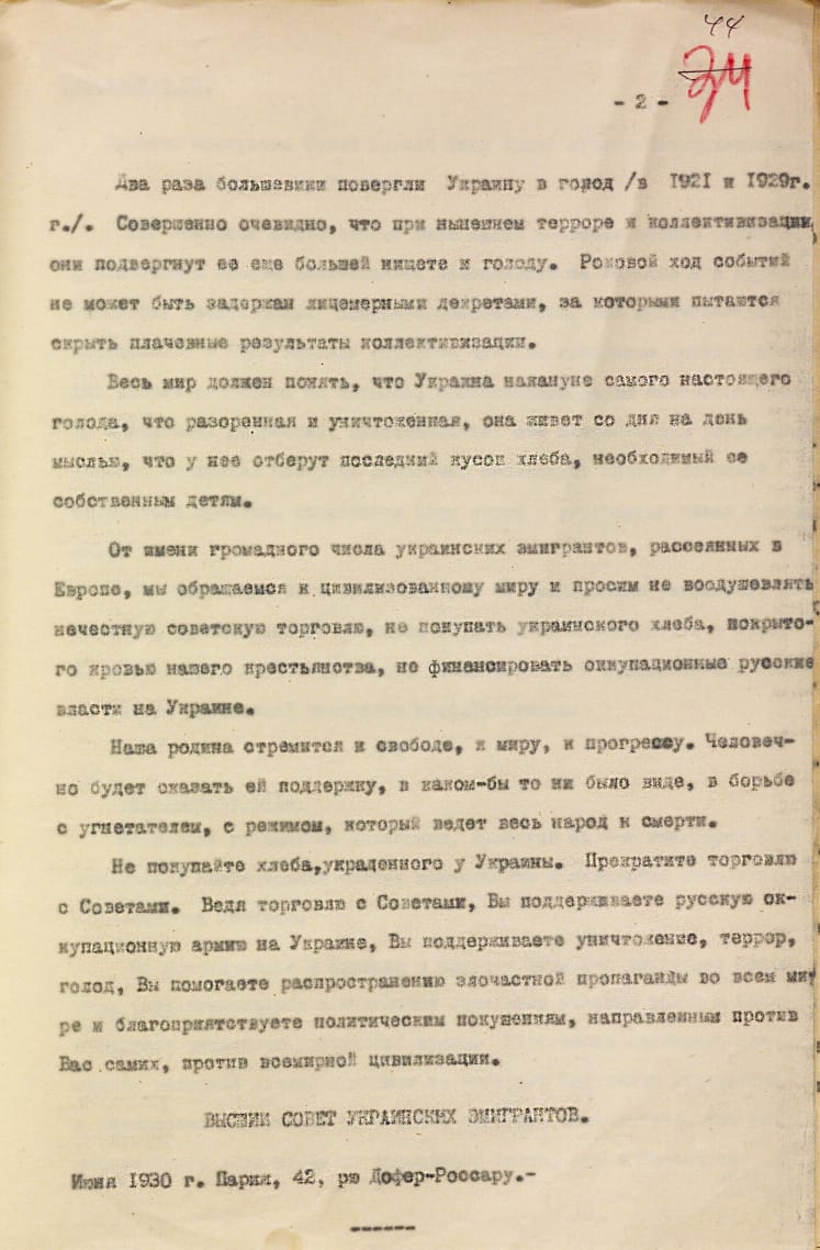 От имени огромного количества украинских эмигрантов, расселенных в Европе, мы обращаемся к цивилизованному миру и просим не поддерживать нечестную советскую торговлю, не покупать украинский хлеб, покрытый кровью нашего крестьянства, не финансировать оккупационную советскую власть в Украине.