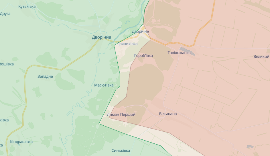 По данным карты, село Лиман Первый Двуречанского района, ранее находившееся в "зеленой" зоне, перешло в "красную" зону, которой авторы карты обозначают захваченные агрессором территории.
