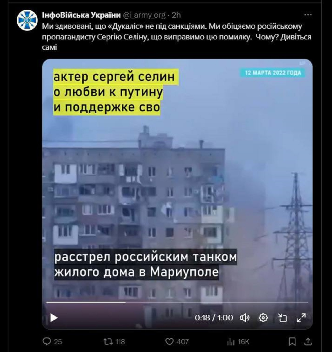 "Мы удивлены, что "Дукалис" не под санкциями. Мы обещаем российскому пропагандисту Сергею Селину, что исправим эту ошибку", - говорится в сообщении.