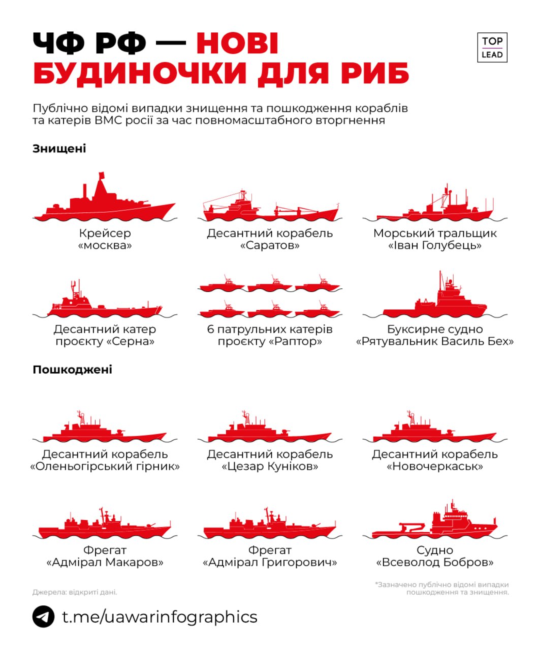 Там отметили, что были уничтожены 11 кораблей и катеров. Еще шесть были повреждены. Речь идет только о публично известных случаях уничтожения и повреждения судов ВМС России с 2022 года.