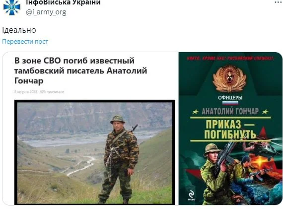 Украинские военнослужащие ликвидировали российского писателя Анатолия Гончара, на счету которого - несколько пропагандистских книг, прославлявших армию России.
