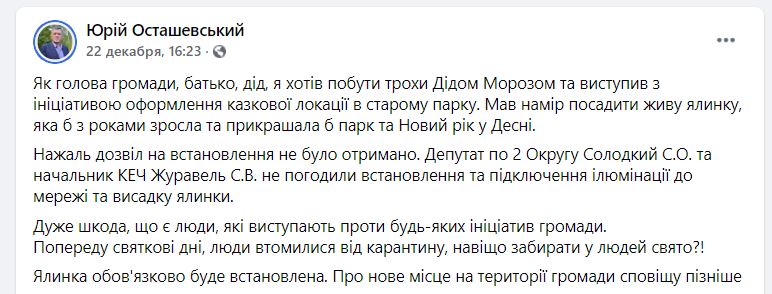 Он отметил, что отказ аргументировали тем, что земля парка принадлежит Министерству обороны. Местная община готова принять гражданские объекты на свой баланс. По словам Осташевского, людей лишили елки, иллюминации и праздники из-за избранного ими же депутата Деснянского поселкового совета и военнослужащего Сергея Солодкого.