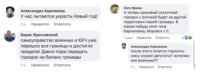 В комментариях жители Десны возмутились, что их хотят оставить без праздника, и отметили, что пора передать гражданские объекты на баланс ОТГ: "У нас пытаются украсть Новый год!", "Городок с елкой будет на остальной территории нашей общины. В каком-то селе типа Карпиловка, Моровск и т.п.", "Самоуправство военных и КЭЧ уже перешло все границы и достигло предела. Давно пора передать городок на баланс общества", "После этого хочется спросить: кому служат депутаты? Жителям или военным?".